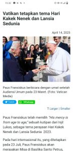 Dalam rangka menyambut Hari Kakek Nenek dan Lansia (HKNL) pada tahun ini, paroki-paroki diajak untuk tetap memperhatikan para kakek nenek dan lansia dalam beberapa bentuk tindakan dan kegiatan. Adapun tindakan dan kegiatan yang disarankan adalah menyapa mereka, berkunjung ke rumah kediamannya serta mengintensikan secara khusus dalam Perayaan Ekaristi.