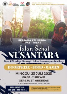 Jalan Sehat Nusantara merupakan program kerja sama antara K3M dengan ME Distrik X Malang. Acara yang akan dilaksanakan pada Minggu 23 Juli 2023 pagi hari tersebut, akan mengambil route jalan-jalan sekitar Paroki Santo Andreas Tidar.